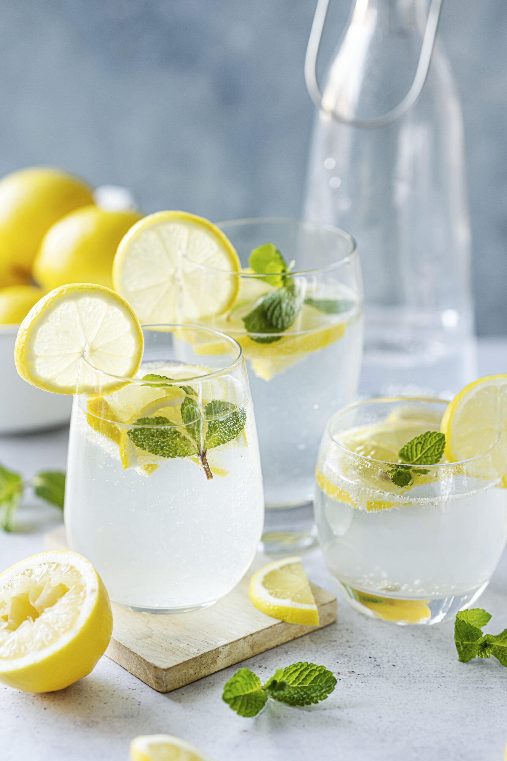 Fresh lemonade soda with sliced lemons in a glass